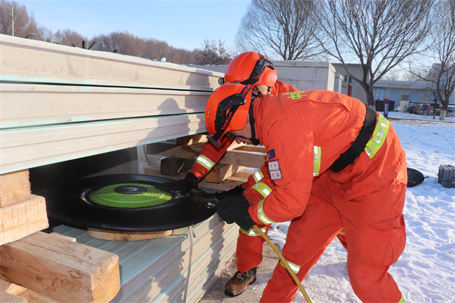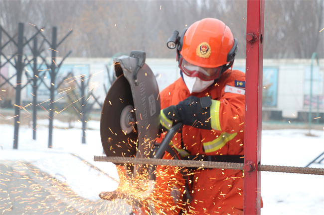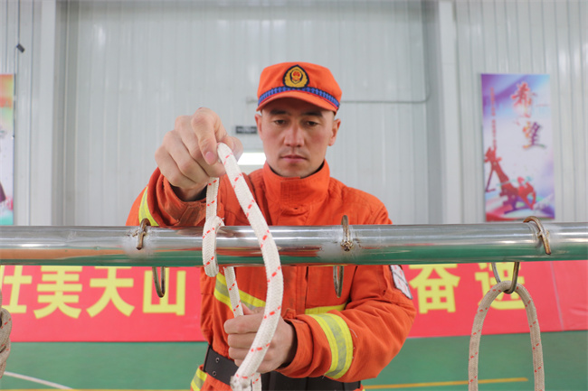 在刚开始面对多种多样的器材和装备时,他起初显得有些茫然无措,但他积极调整心态,虚心请教教员,扎实开展训练,从掌握每一个动作要领、熟悉每一个操作步骤,一个多月的时间便将所有救援装备和器材使用的炉火纯青,回忆起那段时光,别克吐尔满是感慨。除此之外,别克吐尔还善于在实践中发现问题,并寻找到解决问题的新方法。破拆训练时,如何在复杂多样的环境下更省时省力的把一块块厚重预制板凿开是完成任务的最大难题。为了破解这一难题,别克吐尔与队友潜心研究,往往顶着烈日一练就是一上午,完成了上百次对不同距离、不同角度的凿试,终于对角度和发力点有了更深层次的掌握,并将方法经验传授给大家,取得了指战员们的一直好评。
