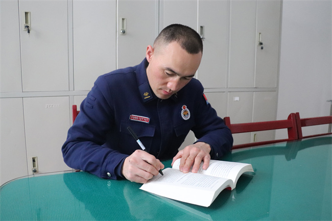刚刚下队不久的别克吐尔,由于出色的身体素质,被中队调入战斗一班,成为一名尖刀班战斗员。作为一民少数民族同志,本应该在理论学习不占优势的他,硬是凭借着比他人更多的努力,在大队理论测试中取得满分的成绩。而这些并不是他唯一的名片,生活中他更是一个“多面手”。大队营区布设政治环境期间,他凭借着入队前学习装修技巧,主动采购材料,携带喷枪,把墙面打扮得焕然一新。结合一年基层生活的成长,获得了中队全体指战员的认可,荣立消防旅生涯第一个嘉奖。