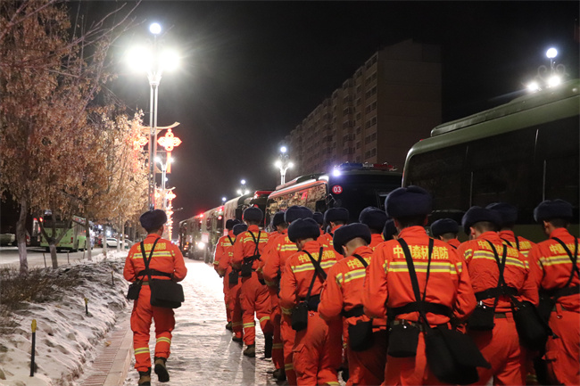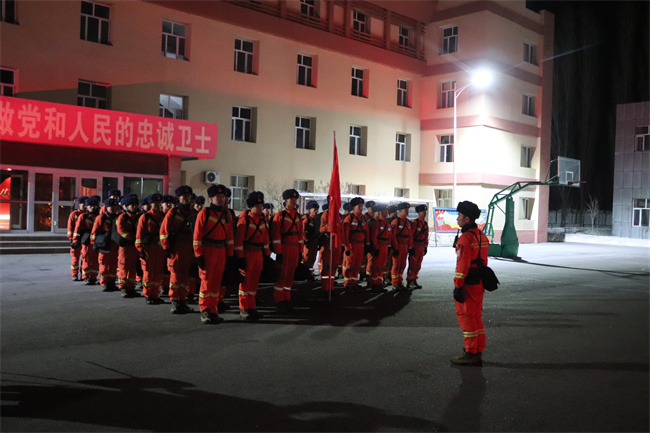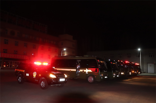 此次演练灾情设定为阿勒泰地区富蕴县发生地震灾害事故,并伴有雨雪、冰冻及夜间等不利因素影响,灾害事故现场建筑设施损毁,大批人员被困。根据上级指挥中心统一调度,大队8车60人,携带90余件套地震灾害救援装备器材和给养物资赶往灾害现场开展救援。