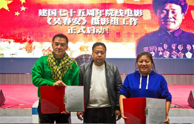 签约仪式上,编剧张萍和导演尹哲签约剧本合作协议;导演尹哲和影片出品人郝宏民签约合作协议。江平、侯光明、许柏林、李国胜、黄晓君、石莹、尹哲等专家学者、市县领导、剧组主创、演员代表等共同为电影《吴春安》拍摄工作按下启动键。
