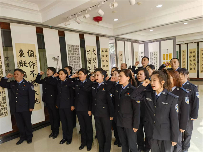 期间,交警大队全体女民辅警在张建龙队长的带领下,面对鲜艳的党旗,进行了隆重的入党宣誓。