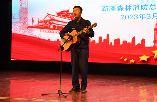 演出在一首《强军战歌》中正式拉开帷幕,在演出过程中,张红旗团长演唱《好男儿》、《最美的歌唱给妈妈》、《我敬祖国三杯酒》等歌曲时,以专业的动作、认真的态度、热情的表演,表达着对指战员的真切关怀。就在“新蓝”们连连拍手叫好时,我们的“新蓝”也没有怯场,一中队新消防员王屹卓、二中队新消防员艾孜买提分别表演了吉他弹唱《海阔天空》和歌曲《父亲的草原母亲的河》再次把整场气氛推向了高潮,张红旗团长进行了点评与指导,希望他们能够再接再厉,将自己的好声音传播到营区的每个角落,唱出自我。