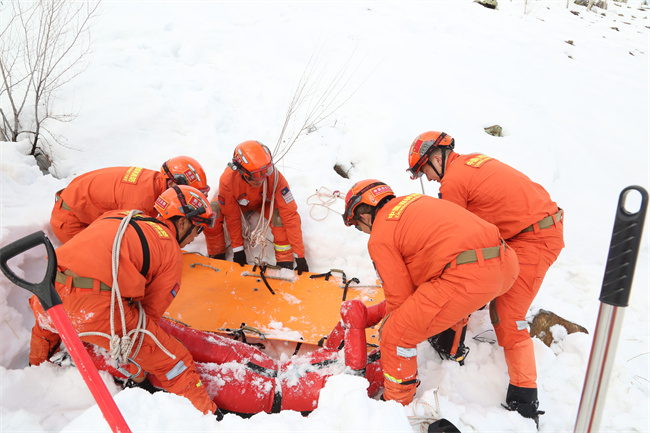 随着搜索范围逐步扩大,探杆探测面积逐步扩大,导致部分区域积雪极易发生位移。“701、701,东侧二组负责区域20米处积雪有位移倾向,二组迅速撤离该区域”对讲机里传来安全员急促的安全预警。在指挥组科学的部署下,人员全部撤离到安全区域,经过五个小时的搜索,在一处山凹地带发现了四名受困者,两支分队第一时间利用应急保温毯对上伤员进行包裹,防止体温流失,随后救援人员合力将伤员运送至医疗救护地点,演练结束。