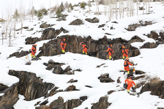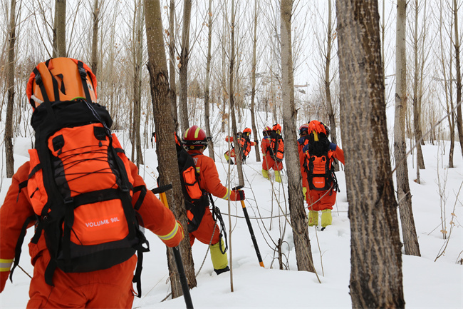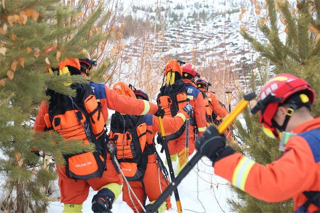 演练现场,参战人员携带冰雪救援装备和应急保障食品、衣物通过爬涉雪地山路行进 3 公里的方式前往搜寻失联人员地点。由科目负责人现场按配备标准检查雪崩救援专业队携带的器材装备和应急物资,徒步行进 3公里,到达事故地点集合。