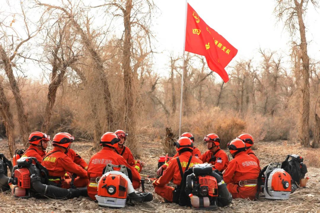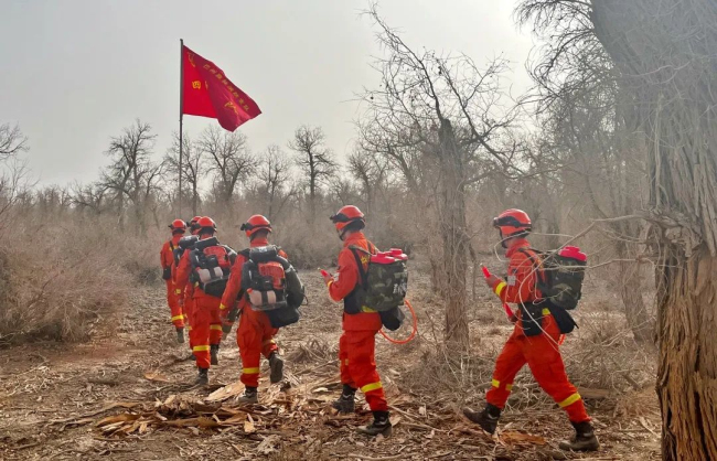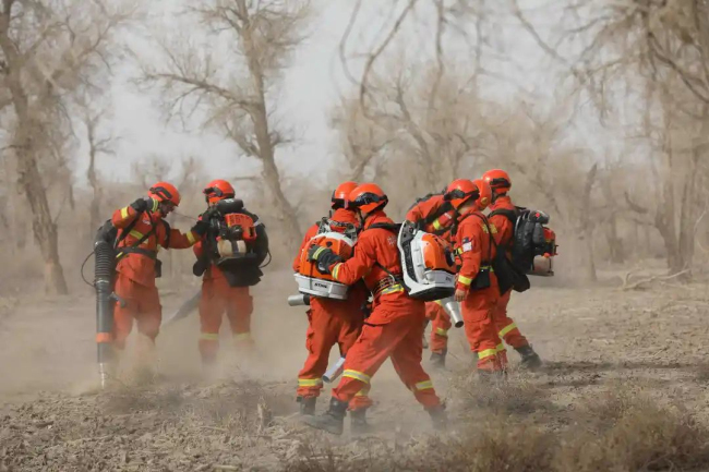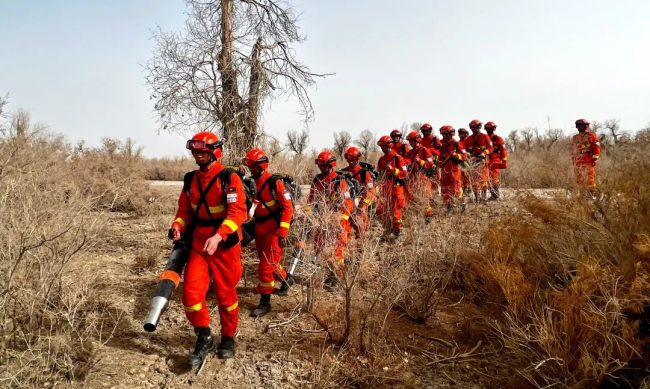 朝阳下,风沙浮尘中,一棵颗如同雕塑般的胡杨树旁,巴州森林消防支队阿克苏大队驻防分队指战员们整齐行进,与沙漠、胡杨融为一体。他们像身边的胡杨一样,发扬勇于吃苦、甘于忍耐、忠于职守、乐于奉献的精神,用忠诚与奉献书写着壮美的青春诗篇。