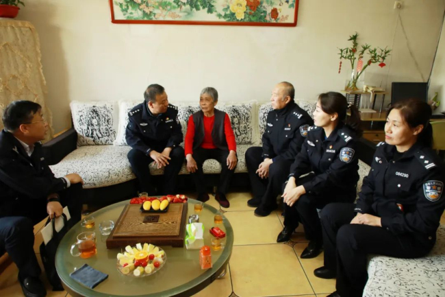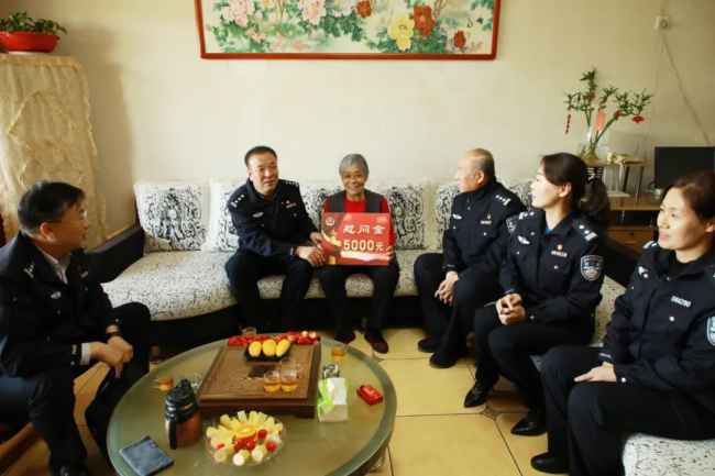 在烈士郭天生家中,房梁与家属亲切交谈,详细询问了其家庭生活情况、了解有何困难、叮嘱警属保重身体并送上慰问金及慰问品。房梁表示公安局党委会切实把爱警暖警措施落实到位,尽力照顾好家属的生活,及时帮助解决生活中的实际困难,让家属切实感受到公安大家庭的温暖。