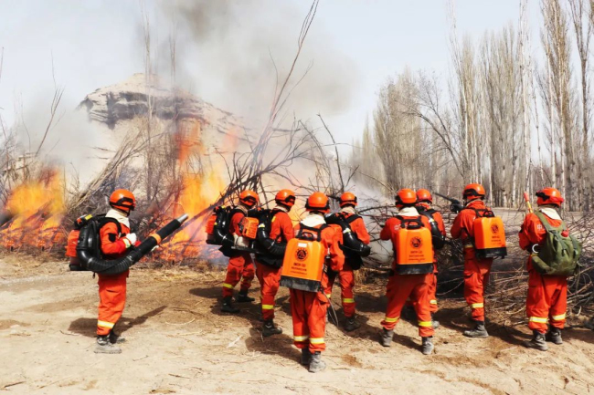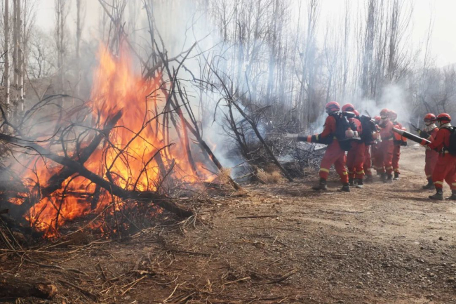 接抗震救灾现场指挥部通报,受“地震”影响,震区附近林区发生森林火灾。大队联合库车市林业和草原局消防应急分队赶赴现场对森林火灾实施扑救。