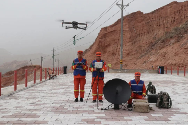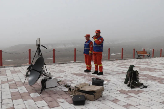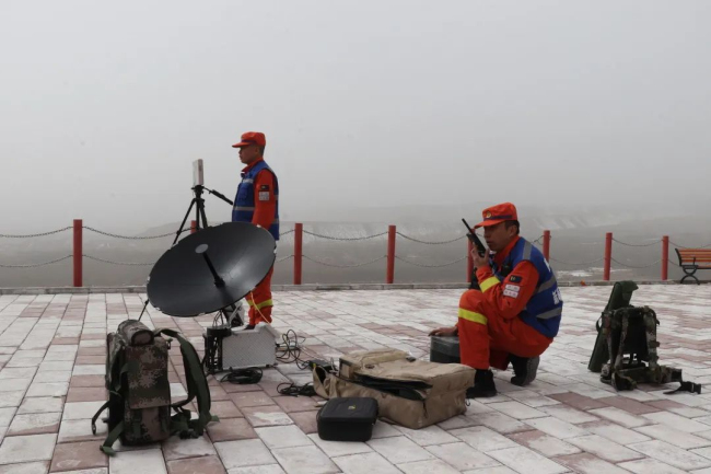 训练中,模拟大山深处森林火灾,道路受阻车辆无法进入,架设无人机侦察录像,规划保障手段、频段和传输路径,设置转信级联高地,指挥调度通信保障队伍分组携装步行前进。