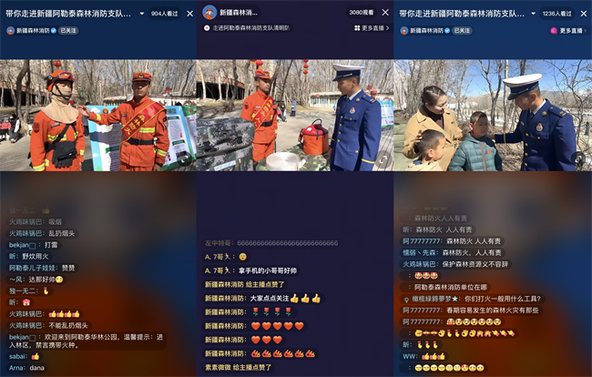 “各位粉丝朋友大家好,我是你们的主播阿勒泰森林消防支队的消防员达那,感谢大家对森林消防事业的关注和支持!”直播一开播,便吸引了众多热情网友与市民朋友的围观与参与。直播间内宣传着森林防火知识、消防安34全内容、防火注意要点等内容。3000多人的“围观”,让森林防火的科普面与宣传度达到了火热。