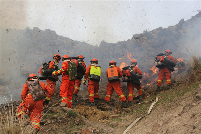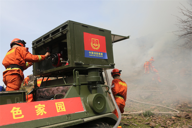 “前面出现多处树冠火和悬崖火,请尽快组织水泵组前往处置”,中队长助理张志强接到命令后,迅速组织人员在火线东侧架设水泵,采取“泵车结合,全程输水”的战法,在斜坡架设水囊对树冠火和悬崖烟点进行处置,全线压制火势,对火场实施以水灭火,确保稳妥高效。