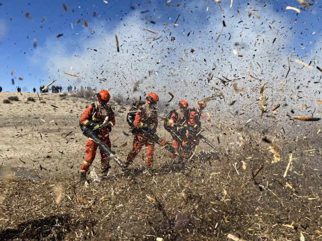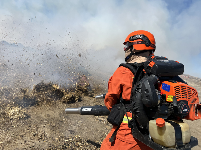 现场防火队员接到通知后全副武装跑向起火点,运用风力灭火机阻断火线、高压细水雾灭掉火源、脉冲水枪喷射起火点、二号工具扑打明火等实施现场扑救,控制火情后,扑火预备队现场跟进清理余火,防止死灰复燃。整场演练,安全、快速、有序,指挥员指挥得当,演练达到了预期效果。