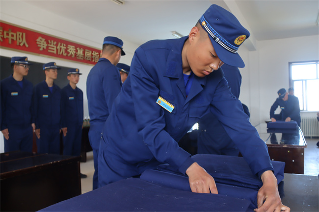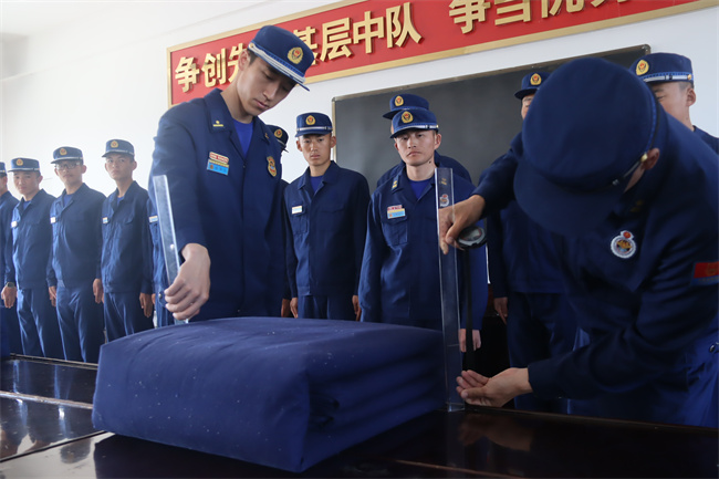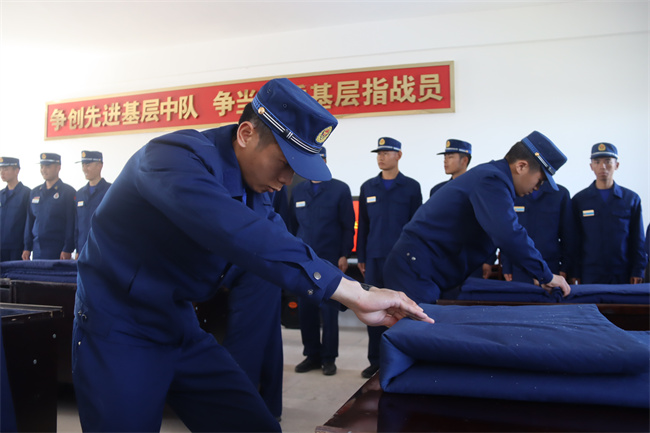 本网讯:(李涛 杨长红)为进一步提高新消防员内务水平,强化纪律作风和规矩意识,近日,新疆森林消防总队新训大队严密组织“叠被子”比赛。