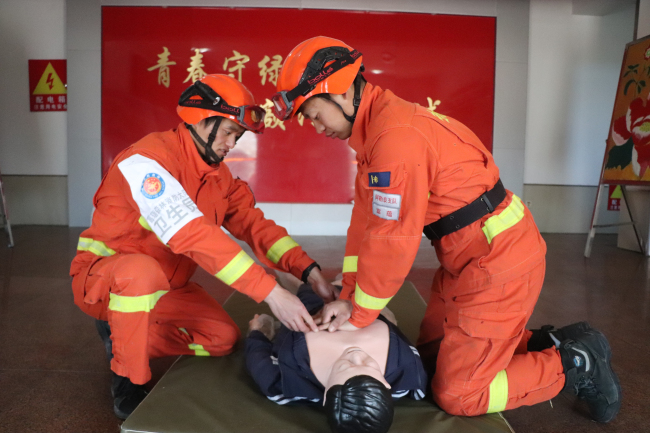 卫生员作为基层医疗工作的骨干,担负着一线卫生保障任务,是与队员接触最紧密的卫生专业人员,对守护消防救援人员身心健康具有不可替代的作用。从卫生防疫,到健康宣讲,从日常伤病诊治护理,到紧急的伤员急救转运,每一个场景都缺少不了他们的身影。“确保患者处在平坦地面,准备进行胸外按压,01、02、03、04……”大队卫生员郭昱成正在使用医学训练模拟假人进行训练。作为卫生员,他不但自己坚持利用休息时间学习专业医疗知识,还主动组织队员进行卫生与救护训练,使每名队员都能掌握包扎、止血、人工呼吸和胸外按压等自救互救技能。