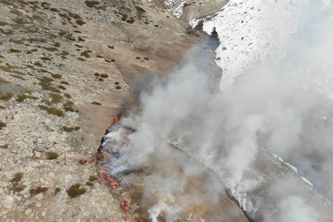 “上午11点,富蕴林区神钟山管护所德热安拜林区发现火情,因风势较大,火势增强,明火蔓延迅速,已危及周围林地和附近牧民群众的生命财产安全。”接到火情报告后,富蕴县迅速启动应急预案,细化任务分工,协调增援力量。县森林消防大队立即分析研判火场态势,明确梯队编成及机动方式,组织靠前指挥,采取摩托化方式向火场实施机动。