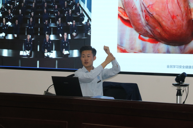 在为时120分钟的讲座中,廖思奇老师通过理论讲解与现场演示的方式,将急救知识、救护技能与日常生活实例相结合,从合理膳食、适量运动、常见疾病预防和职业病等方面讲解了大家比较关心的健康常识。同时重点介绍了心肺复苏术的具体步骤、注意事项,并就判断患者有无意识反应、将患者置于复苏体位、开放气道、判断有无呼吸、口对口吹气、判断有无颈动脉博动、胸外心脏按压及突发意外情况的自救和互救进行了详细的讲解。用扎实的理论、典型的事例给大家上了一堂生动精彩的健康知识课。