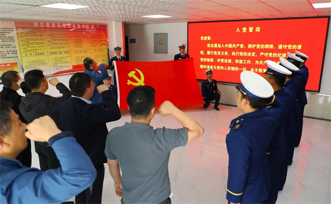 参观学习结束后,参加党日活动的党员在营区整齐列队,重温入党誓词。“我志愿加入中国共产党……随时准备为党和人民牺牲一切,永不叛党!”全体党员紧握右拳,面对鲜红的党旗庄严宣誓,字字千钧的铮铮誓言在营区久久回荡,全体党员仿佛回到了当初那个庄严而激动的时刻。