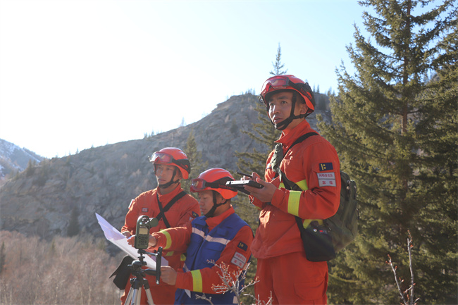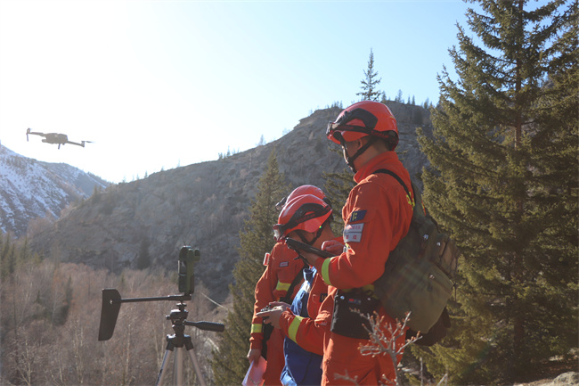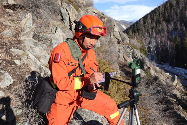 中队长刁伟说道:“可可托海景区以河谷次生林为主,主要是分布在河流两岸的天然阔叶林,具有灌木林地多,中幼林少,成、过熟林多等特征。林下可燃物大多为阔叶和枯树枝,厚度5公分……”大队利用无人机和相机进行全景尺度画面拍摄和近景尺度画面拍摄,对林区内林下可燃物概览、防火基础设施、施工场地、“树线矛盾”和林下可燃物近览、烟头、塑料物、野垃圾等进行数据收集。