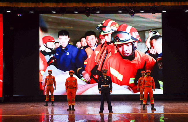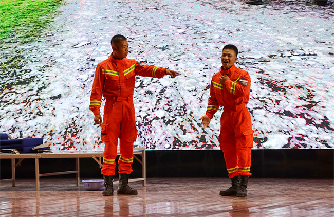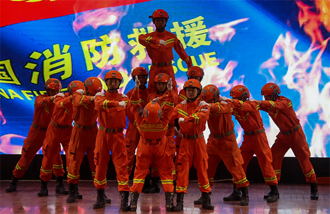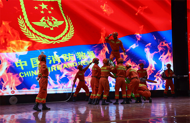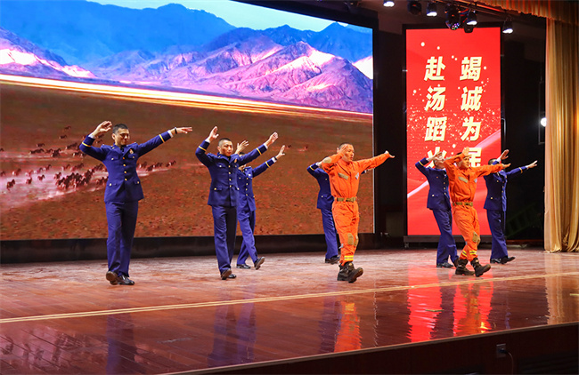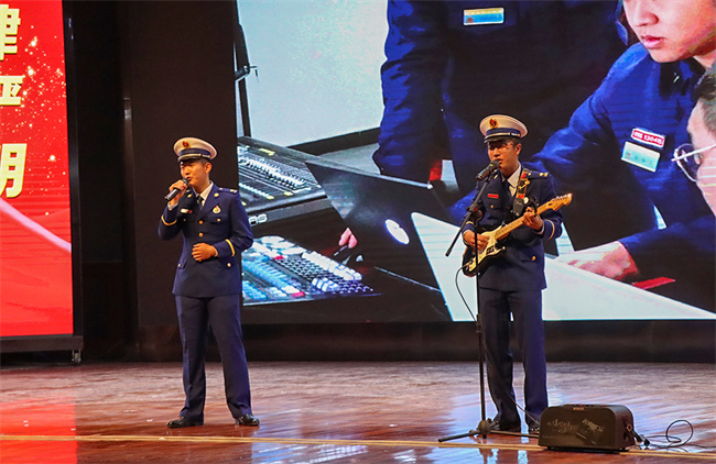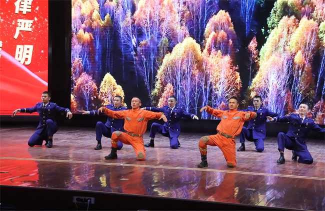 据了解整场演出节目均由总队预任班长(分队长)培训队和新训大队共同编排,涵盖了歌曲、舞蹈、小品等13个节目。其中由吾尔开西、哈米提等人带来的民族舞蹈串烧曼妙的舞姿,悦耳的音乐,将民族风采展现得淋漓尽致,吉他弹唱《那些年》把思绪拉回那个能够张扬肆意,能够开怀大笑的年少时光,带领大家重温青春岁月中不可复制的温暖与美好。“come on 别走开,和我一起嗨,跟着节奏来摇摆请你不要想太多……”郭鑫指导员、谭盾威等人带来的现代舞《舞动青春》,尽情展现了青春与激情的碰撞,活力与动感的融合。小品《超级神探》故事情节幽默搞笑,演员利用灯光和道具夸张地将情景再现,引导在场指战员无不捧腹大笑;“那夜的雨也没能留住你 山谷的风它陪着我哭泣 ……” 歌曲独唱《可可托海的牧羊人》悲婉深沉的歌声令在场的所有人陷入深深遐想;“你们是真的英雄,也许只是一束微光,但是微光也无比辉煌闪烁,也许向前就会牺牲,但是哪怕牺牲也要义无反顾大写的生命有一种就叫舍生取义”诗朗诵《你们是真英雄》表演者慷慨激昂,讲述了消防指战员浴火而生、向火而行的无畏事迹,引人深思。