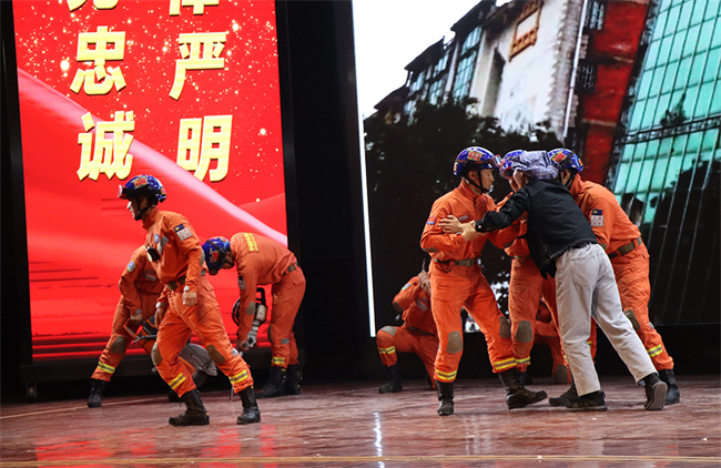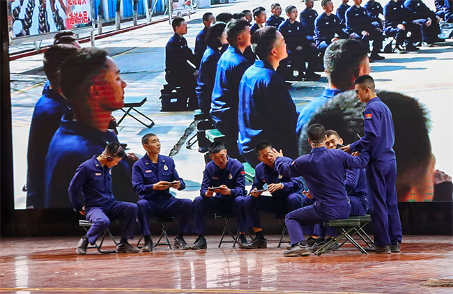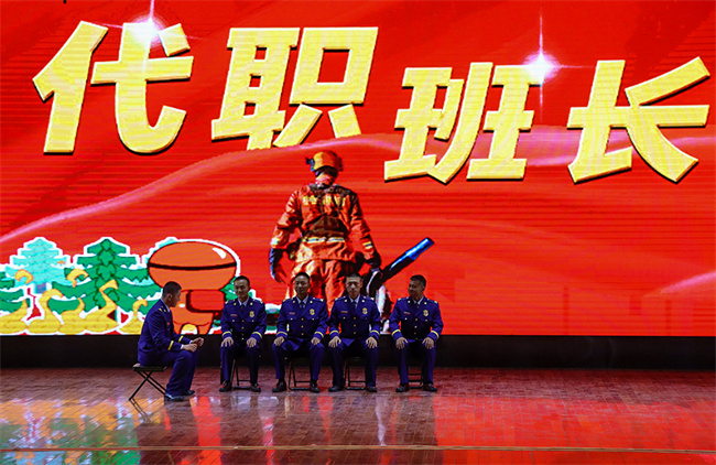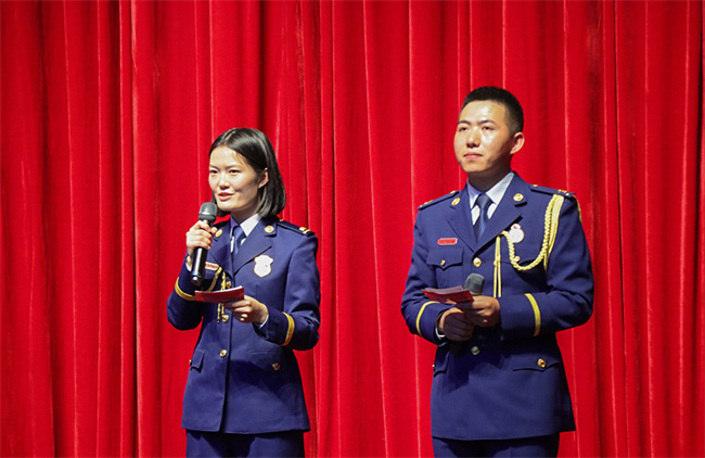 活动伊始,张劲松教导员代表新训大队党委为晚会致辞,同时向在场的全体指战员及家属致以节日的慰问和祝福。二十时三十分钟晚会正式开始,新训大队礼堂内歌舞阵阵,人头攒动,热闹非凡。一场震撼激情四射的开场舞蹈《逆行冲锋》拉开了晚会的序幕,情景剧《我宣过誓》、小品《代职班长》等一系列精彩的节目赢得了现场观众的阵阵掌声。