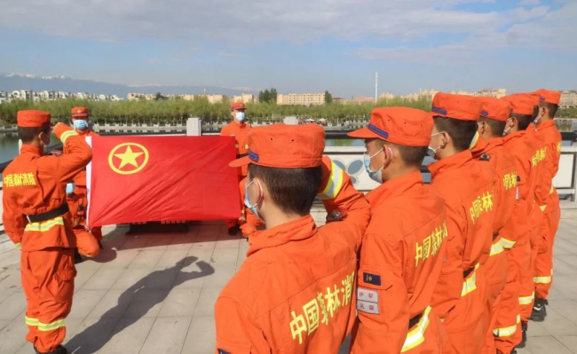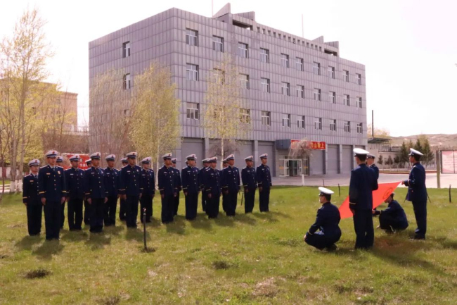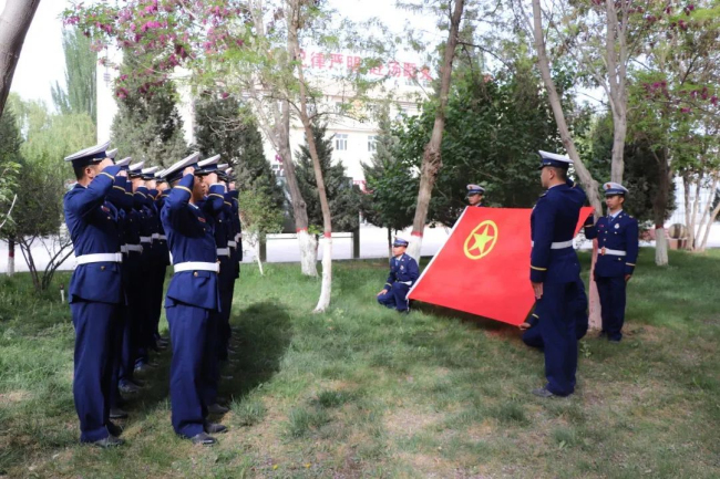 “我志愿加入中国共产主义青年团,坚决拥护中国共产党的领导,遵守团的章程,执行团的决议,履行团员义务,严守团的纪律......”伊犁支队紧紧围绕主题团日活动开展重温入团誓词活动,一字一句铿锵有力,庄严而又响亮的宣誓声在空中回荡。鲜红的团旗下,伊犁支队全体指战员高举右臂,用满腔热血抒发消防救援人员爱岗敬业的决心。