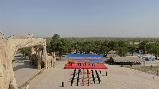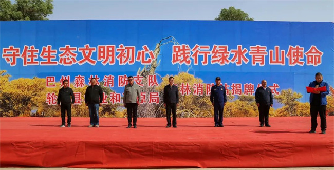 仪式现场人员整齐列队,轮台县委常委、宣传部部长张占疆同志致辞中对巴州森林消防支队多年来对重点林区防火灭火工作付出的特别贡献表示感谢,并要求轮台县有关单位积极配合巴州森林消防支队,大力推进以“早扑灭、早救援”和快速到达现场实施救援为目标的森林消防站建设。而后,巴州森林消防支队李孝军支队长与轮台县林业和草原局局长麦提热依木·克热木同志共同为森林消防站揭牌。