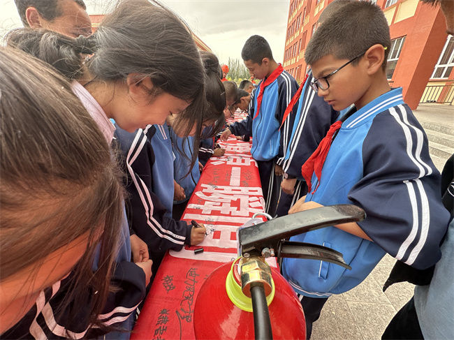 演练结束后,消防宣传人员采取集中授课的形式对学生以及教师开展森林消防知识和地震自救互救常识讲座,用通俗易懂的语言向师生讲解了森林防火和地震自救互救的基本常识、灾中如何做好防范和科学自救互救等内容,总结防火、防震小口诀,有效帮助师生高效记忆,确保全体师生在灾害发生时能沉着应对、冷静处理、安全逃生。并现场演示了如何使用灭火器扑灭油盆火。师生们主动报名参与实践,在消防员的指导下,体验了使用干粉灭火器扑灭油盆火,切身感受到发生火灾时扑救火患的情景。