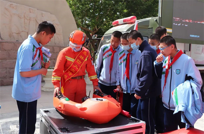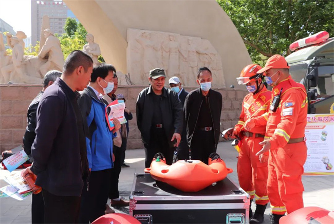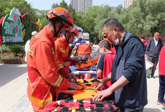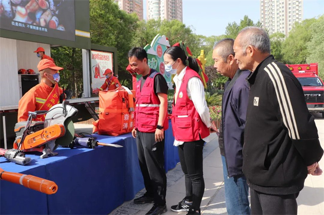在应急救援装备器材展示区,展示了灭火主战装备、地震救援装备、水域救援装备等多种装备器材吸引了群众前来咨询和观看。消防员现场演示了各类装备器材的功能和使用方法,赢得了现场群众的一致好评,极大调动了现场群众主动参与、学习防灾减灾安全常识的热情。