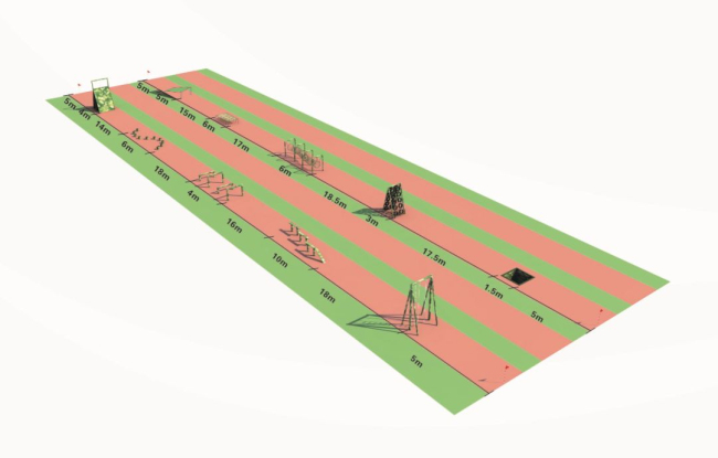 200米灭火障碍由高架速降、独木跨桥、横木翻越、塔头跳跃、峭壁吊绳、陡坡冲刺、密林匍匐、灌木穿网、翻山越岭、跨跃沟渠共10个障碍物组成。