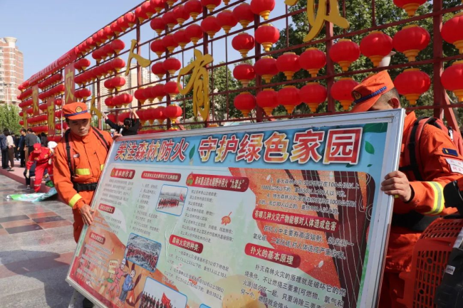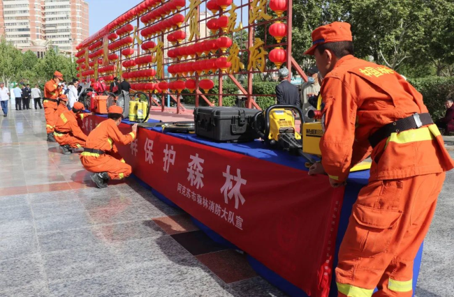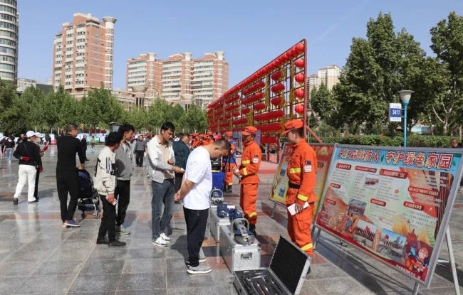 宣传队伍深入阿克苏市世纪广场周边人员密集地带,采取定点宣传和流动宣传的方式,并在醒目地段展示灭火主战装备和地震救援装备,悬挂防火宣传标语,发放防灾减灾宣传单。通过宣传森林防火条例、森林防火知识、地震自救互救的方法向往来群众宣传防灾减灾知识,真正把“以防为先、全民联动”的理念落到了实处。
