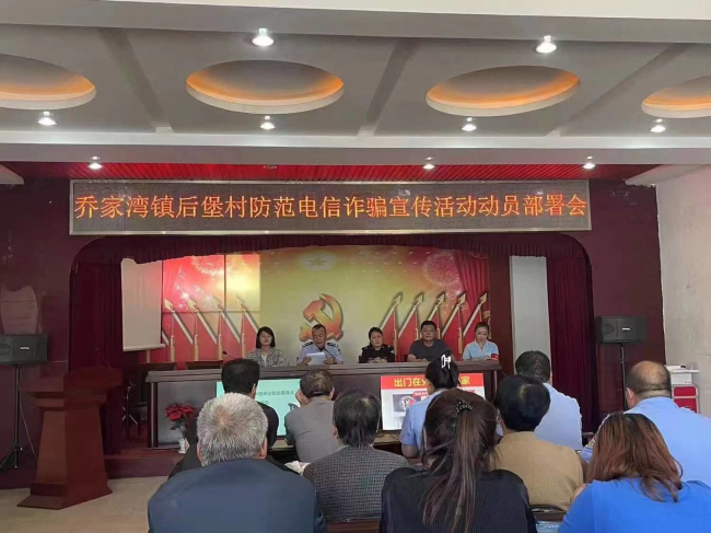 落实具体责任。召开防范电信网络诈骗宣传活动动员部署会,组织乔家湾派出所、司法所、移动公司工作人员,后堡村两委主干,永安义警以及后堡村部分村民参加会议,专题对防范电信网络诈骗宣传工作进行安排部署,高位推进,层层落实,形成干部带头、群众参与的良好氛围。