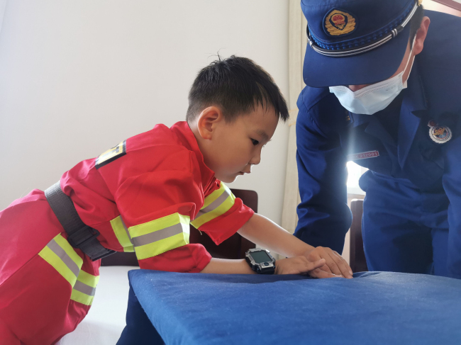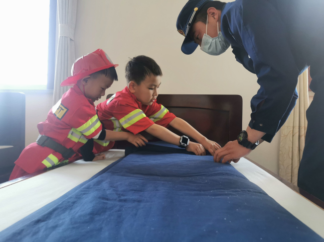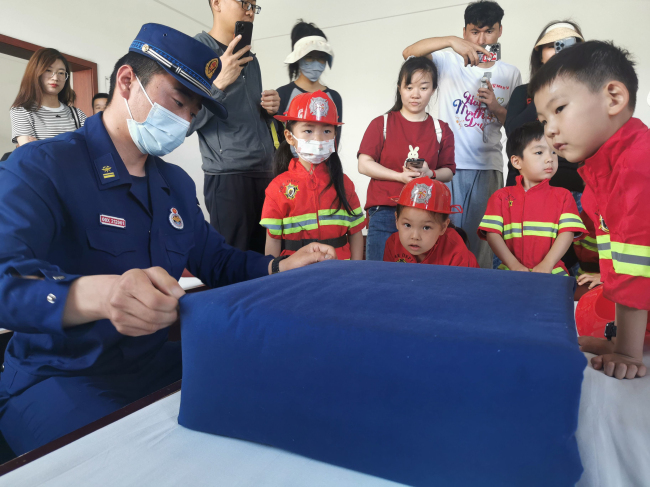 “哇,好整齐啊!”“消防员叔叔,能不能教教我!”当“小萌娃”们走进班宿舍里,干净的卫生环境、整齐的被子、有序的内务设置让“小萌娃”们大开眼界,指战员现场演示叠被子方法、步骤和技巧,一边讲着要领,一边手把手地教着,“这就对了,有棱角了,大家回去后也要把自己的被子叠好哦。”