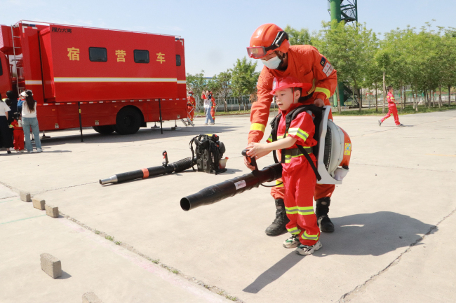 “这个就是水枪,我在电视上见过,消防员叔叔就是用这个去灭火的……”在指战员的带领下,“小萌娃”们首先参观了风力灭火机、背负式书枪、油锯等装备,讲解员不仅为他们生动讲解了各种装备的使用方法和功能用途,还在确保安全的前提下,让“小萌娃”们在现场当起了小小“消防员”,亲身体验了灭火装备操作。