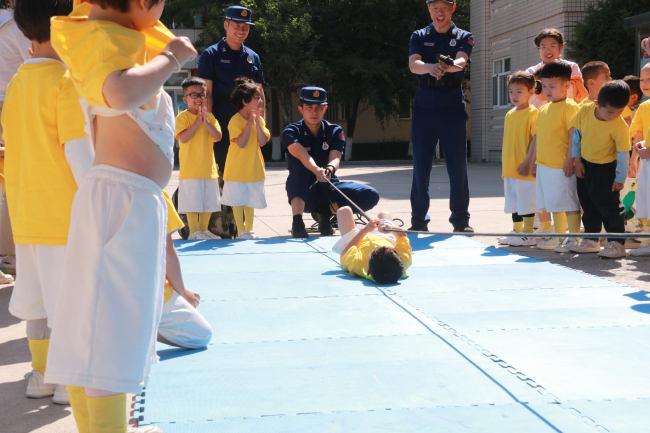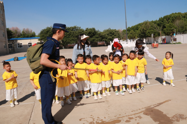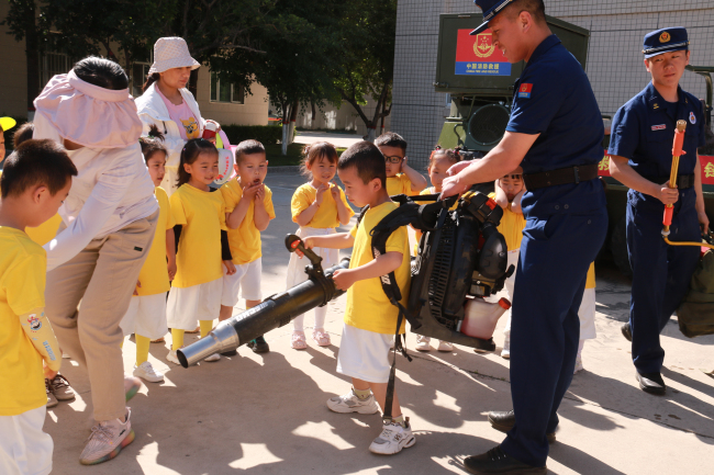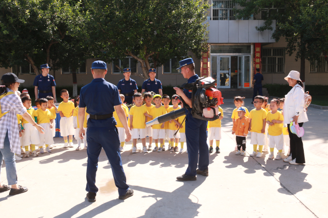 室内的内务展示还不够吸引师生们的眼球,那么室外装备体验场一定可以满足师生们的好奇心。在装备展示区,消防解说员通过童趣的语言讲解与现场示范相结合的形式,向幼儿展示了风力灭火机、水枪、油锯等森林灭火装备和救生圈、干式及湿式救援服、抛投器等水域救援装备。期间,小朋友们纷纷举手向消防救援“小哥哥”提问,天真的话语给大家带来阵阵笑声,针对小朋友们提出的问题,消防员一一解答。