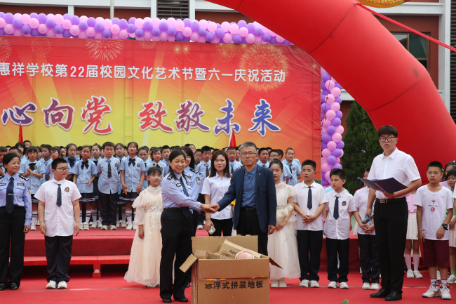 本网讯:(田哲斌)警心暖童心,节日送关爱。5月31日上午,在“六一”儿童节来临之际,尧都区公安局工会主席、妇委会主任曹国萍一行来到临汾惠祥学校,观看了学校组织的庆祝六一节目汇演,开展关爱留守儿童活动。