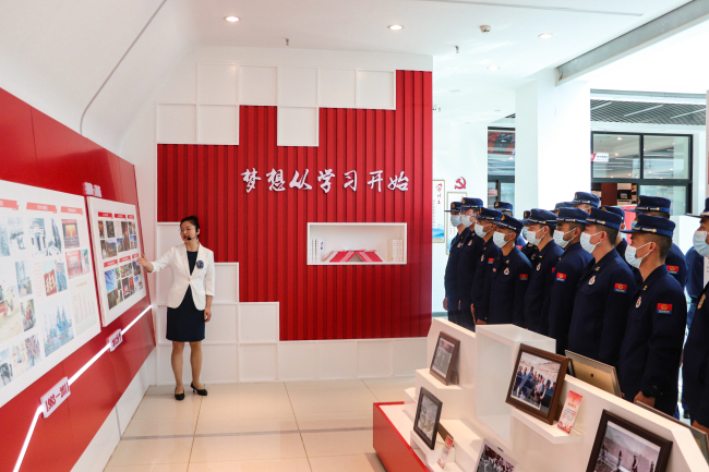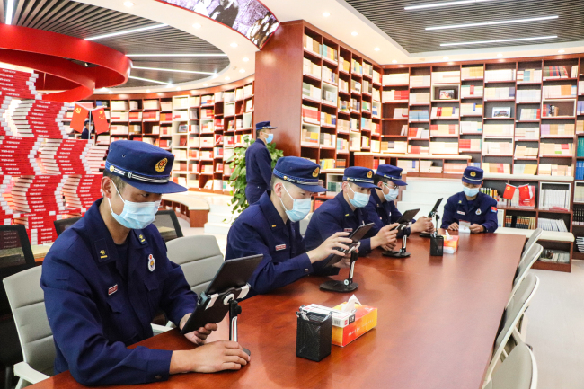 跟随讲解员的脚步,消防救援人员先后参观了图书馆内的服务区、党史区、藏书区、宣誓区、党员学习区、主题阅读区、青少年阅读区等功能区域。每到一处,大家都认真聆听讲解,不时询问交流。在阅读室,队员们现场研读丰富的党建图书和报刊,互相推介书籍、分享读书内容及感受,大家在分享讨论中侃侃而谈,抒发真知灼见,智慧的火花在相互之间碰撞,书本的浓香在彼此之间飘逸。