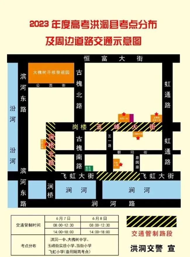 四个考点分别为:洪洞一中、大槐树中学、玉峰实验小学、西街小学