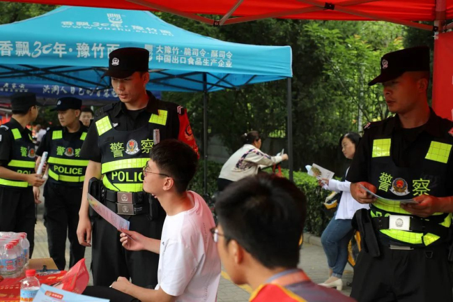 为确保高考顺利进行,巡特警大队和各派出所加大巡逻力度,在各考点周边科学布控;交警大队合理调配警力,及时疏导考点周围的人员和车辆,确保交通安全、有序、通畅;反诈民警积极向考生家长发放反诈宣传单,讲述诈骗经典案例,提高群众反诈意识,全面护航高考。