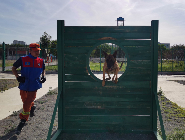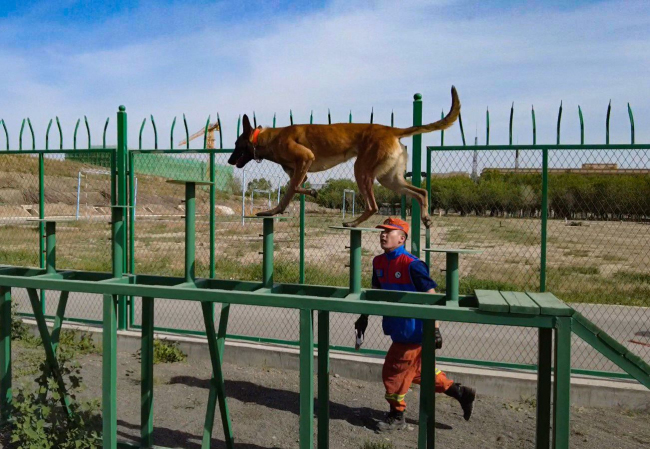 攀登障碍是强化搜救犬在不同地形和环境执行任务的能力。“luck!去!”在搜救犬障碍训练场上,训导员尕藏索南将右手高高举起。搜救犬“luck”以迅雷不及掩耳之势冲上障碍板,穿越狭小的圆圈架,在高空梅花桩上快速移动,飞驰在独木桥上,一跃而过2.5米断桥,面对高低起伏各不相同的多组障碍设施,训导员和搜救犬配合默契,一气呵成。