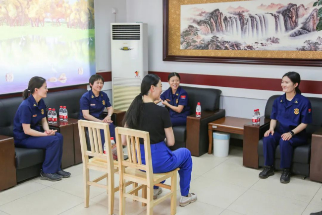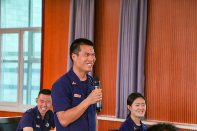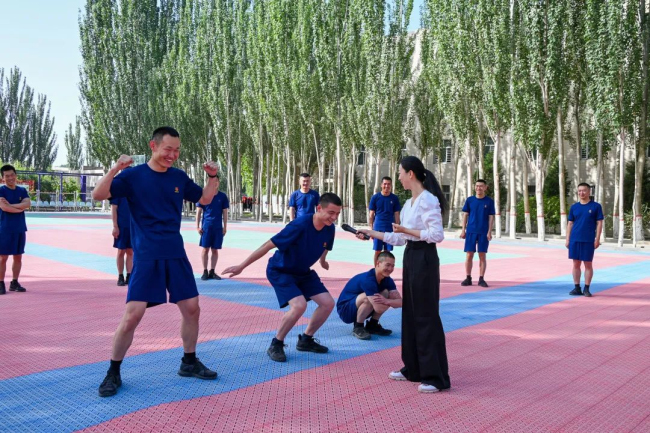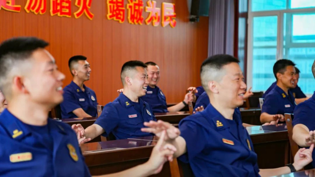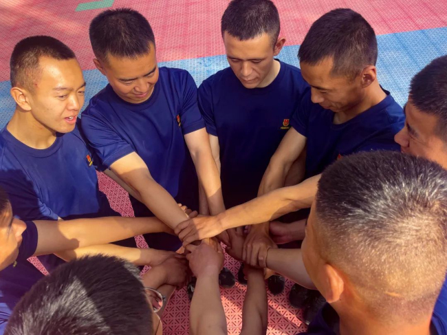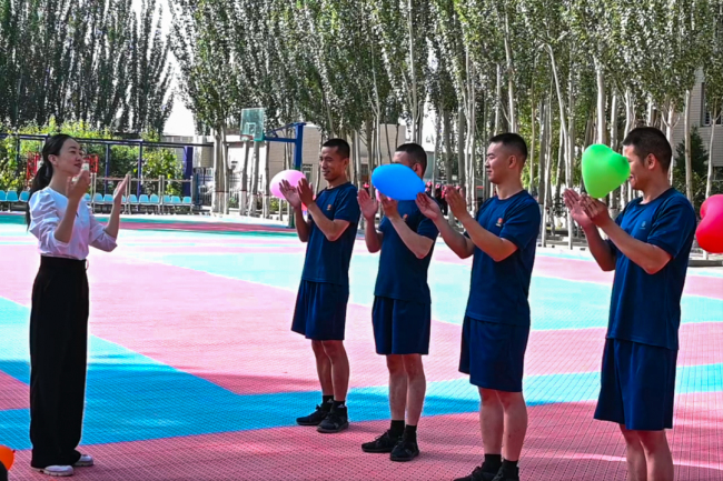 在训练场上,一个个互动游戏轮番上场,一张张笑脸引燃现场,平日里严肃认真的训练场弥漫着轻松愉悦,刘伊漫助理、江娇娇老师和指战员一同开展心理团体辅导游戏,进一步让大队心理骨干掌握疏导方法,让指战员们的烦恼和压力得到舒缓。“真是太厉害了,我做了一个动作就能读懂我的心理!我要好好学习请教下!”参加完心理游戏后,四中队班长员宝宝发出这样的赞叹。