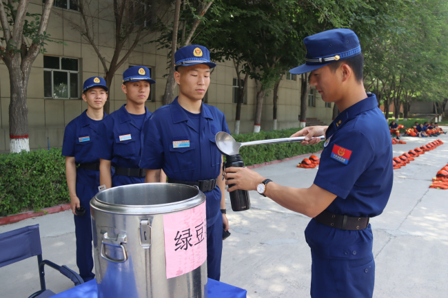 把好“保障关”强化治疗水平。大队针对夏季容易出现的疾病和中暑症状,紧紧抓住“防”这个关键,及时配备藿香正气水、板蓝根、感康以及多种防治胃肠疾病的药,并采购了大量风油精、花露水、清凉油等防暑降温药品,以备应急之用。高温天气组织训练时,队医、卫生员深入训练场巡诊,发放藿香正气水、仁丹、清凉油等解暑药品,针对炎热天气炊事班精心准备防暑降温的绿豆汤、西瓜等解暑降温类食品,指战员在训练后及时补水防止中暑症状发生。