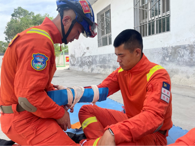 固定运用于四肢、脊椎等骨折,是骨折创伤救护的一项基本任务。正确、良好的固定受伤部位,可以最大限度地减少伤员的疼痛,同时避免对伤员造成其他组织损伤、神经损伤或开放性骨折等二次伤害。驻防分队分别从火场、地震、山岳等不同条件下就地取用器材入手,针对不同环境下不同的处理方式进行针对性训练。