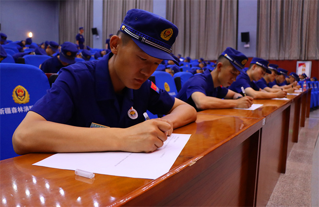 理论是指导森林消防员完成任务的坚实基础。前期大队采取个人自学、集中学习相结合的方法,利用休息日、饭前饭后等时机组织背记,每月组织一次理论测试。在测试过程中,监考人员严肃认真,确保测试秩序正规、有序进行,参考人员能够严格遵守考场纪律,积极作答,在规定时间内全部交卷。通过测试有效检验了消防员近期对条令法规学习和相关理论知识的掌握情况,进一步激发了学习热情,达到了以考促学的目的。