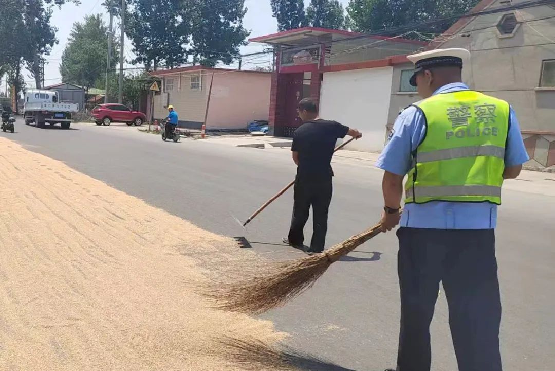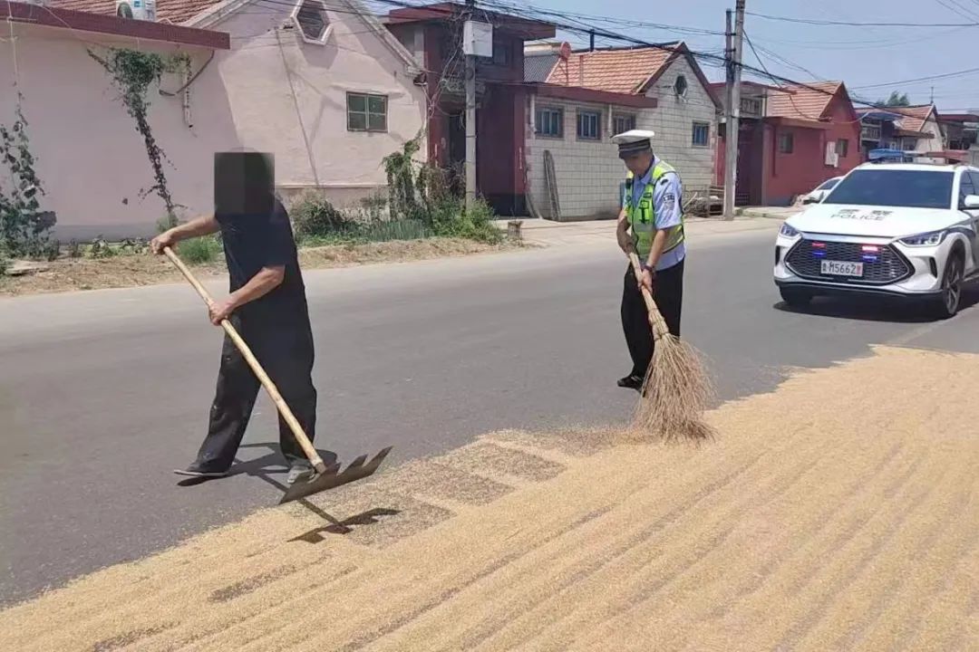 6月23日上午,博兴公安交警大队执勤民警巡逻至锦秋街道某路段时,发现有一村民在道路上晾晒麦子几乎占据了一半以上的道路,严重影响其他车辆和行人的正常通行,存在交通安全隐患。民警当场对占道晒粮的村民进行交通安全宣传,使其明白占用道路晒粮的危害和可能引起交通事故需承担的法律责任,随后与村民一起用工具将麦子清扫到路边,最大程度恢复道路的正常通行功能。