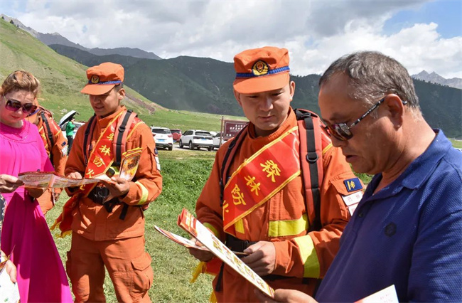 在阿克苏,“同志您好,最近气温较高,进山入林期间请勿携带火种,这是我们的防火宣传单,请您看一看,里面印有在景区游玩时需要注意的一些森林防火常识。”有着避暑圣地之称的塔村景区入口处,三级消防士杜生辉不断向进入景区游玩的游客发放森林防火宣传单,提醒游客在景区注意森林防火。