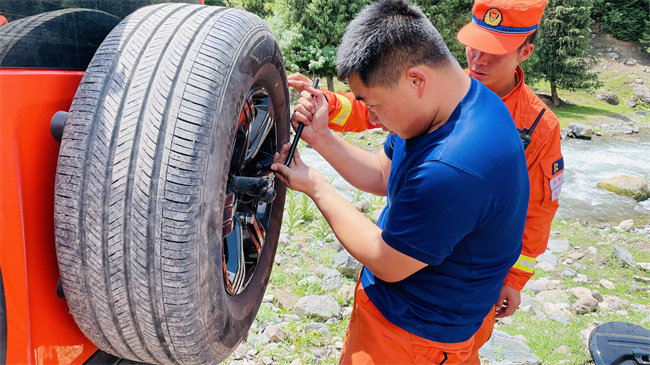 了解情况后,分队两名驾驶员立即从车内拿出维修工具,用千斤顶支起车辆、躺在车下卸下备用轮胎、蹲下身子帮助游客卸下故障轮胎,边操作边提醒游客在车辆保养时,对轮胎的检查必不可少,只有保持车况良好,上路行驶才能减少意外的发生。