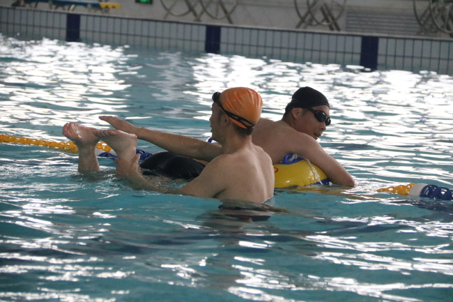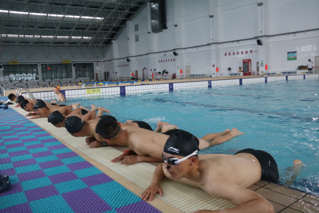 “手放开,双腿用力蹬夹水,换气时节奏要掌控好……”训练期间,教练员采取理论讲解、示范操作、分组练习等教学模式,示范讲解了游泳的基本动作要领,“手把手”地教参训人员怎么憋气和换气,怎么打腿、潜水及短距离游泳等游泳技巧。并针对人员游泳水平参差不齐的实际,将人员分为“强化组”和“训练组”,“强化组”注重动作的规范,并适度增加游泳距离和强度;“训练组”从熟悉水性、打腿、潜水及短距离游泳等分步进行,量身定做训练“套餐”,把会的练精,把弱的练强,确保总体水平跨越提升。