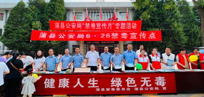 本网讯:(张雯宣)为进一步推动2023年全民禁毒宣传月宣传工作的有效开展,掀起全民参与禁毒斗争的热潮。6月26日,在第36个国际禁毒日,蒲县禁毒办组织县总工会、团县委、妇联、社管会和社戒社康服务中心等单位在蒲县公安局门口开展以“健康人生 绿色无毒”为主题的禁毒宣传活动。政府副县长、县禁毒委员会主任、公安局党委书记、局长席俊峰等领导参加活动。