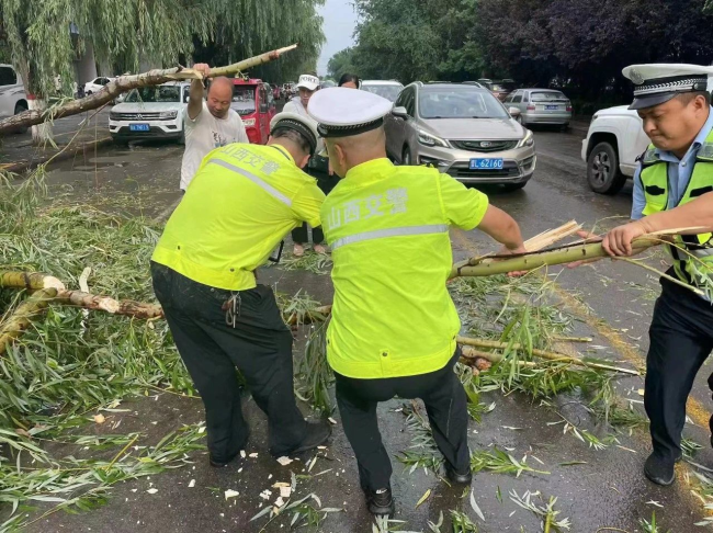 6月28日上午,交警大队城关中队巡逻至涧河路段时,因近期大雨、刮风等恶劣天气,导致路边的大树被吹倒折断在路上,致使通行受阻,存在较大安全隐患。民辅警立刻下车在大雨中清理路障,警示提醒过往车辆减速慢行,由于树枝较大,经过十几分钟的努力,终于将倒在路上的树枝全部清理,移到了不妨碍交通的路边,及时消除了道路安全隐患。