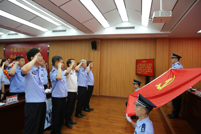 表彰大会在奏唱《中华人民共和国国歌》中拉开帷幕,崔军同志率班子成员和与会党员民辅警重温入党誓词;党委委员、政工监督室主任张秀峰宣读了《关于表彰先进基层党组织、优秀党务工作者、优秀共产党员的决定》;与会领导为老党员颁发“光荣在党50年”纪念章,为受表彰的2个先进基层党组织、25名优秀党务工作者和51名优秀共产党员颁奖。