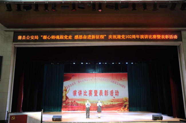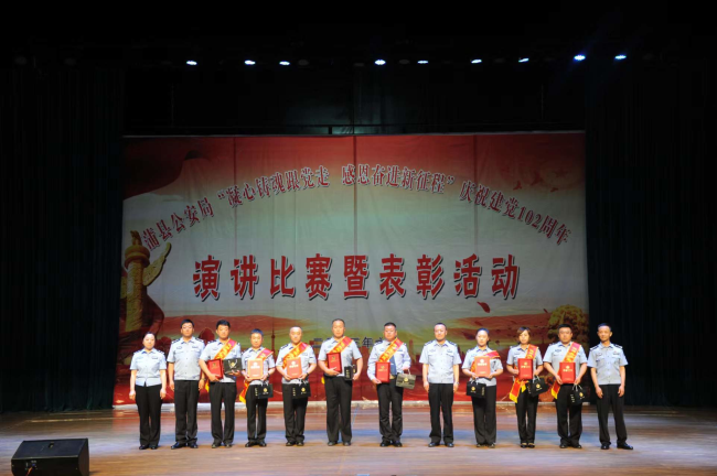 本网讯:(张雯宣)为热烈庆祝中国共产党成立102周年,表彰先进、鼓舞士气,丰富警营文化,推动公安工作和队伍建设高质量发展,6月29日,值“七一”前夕,蒲县公安局隆重举行“凝心铸魂跟党走 感恩奋进新征程”主题演讲比赛暨表彰活动,热情讴歌党的光辉历程,激励广大民辅警忠诚履职、筑梦前行、再立新功。县委常委、政法委书记席江红,副县长、公安局党委书记、局长席俊峰,县人民法院院长李小波,县人民检察院检察长崔晓纲出席活动,县公安局领导班子成员、全局民辅警(除值班备勤外)及受表彰的优秀共产党员代表参加活动。